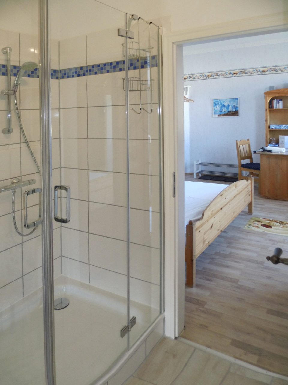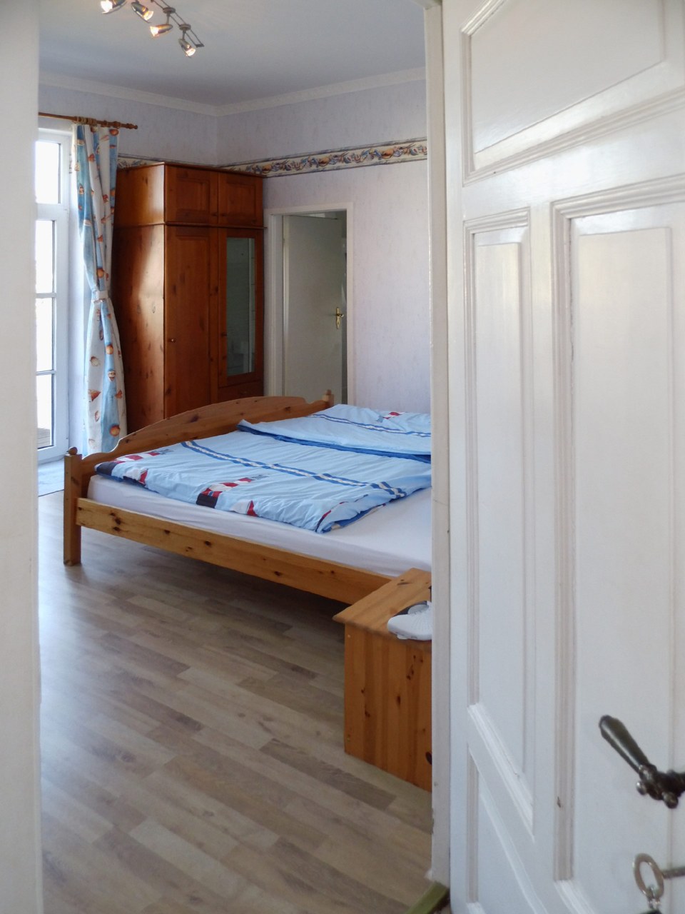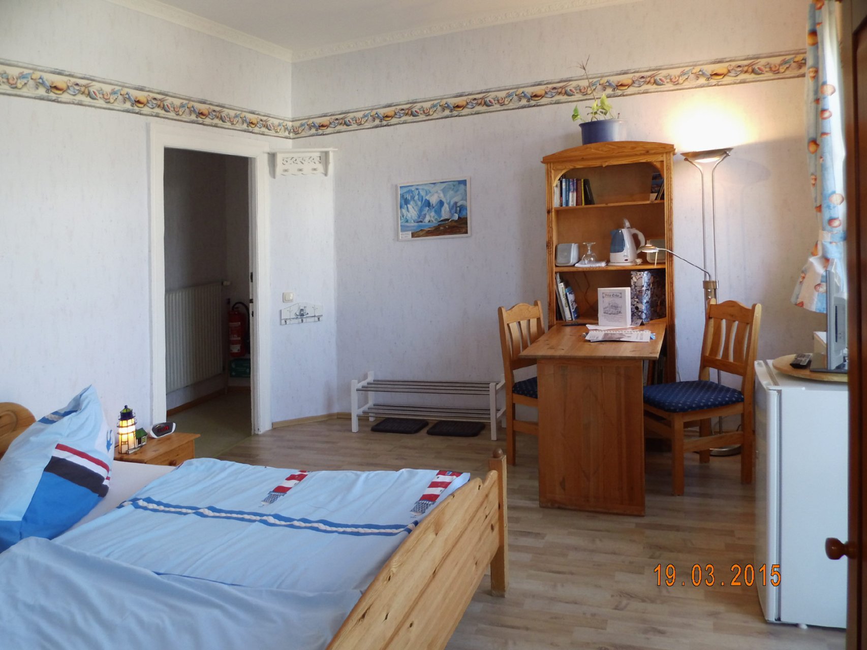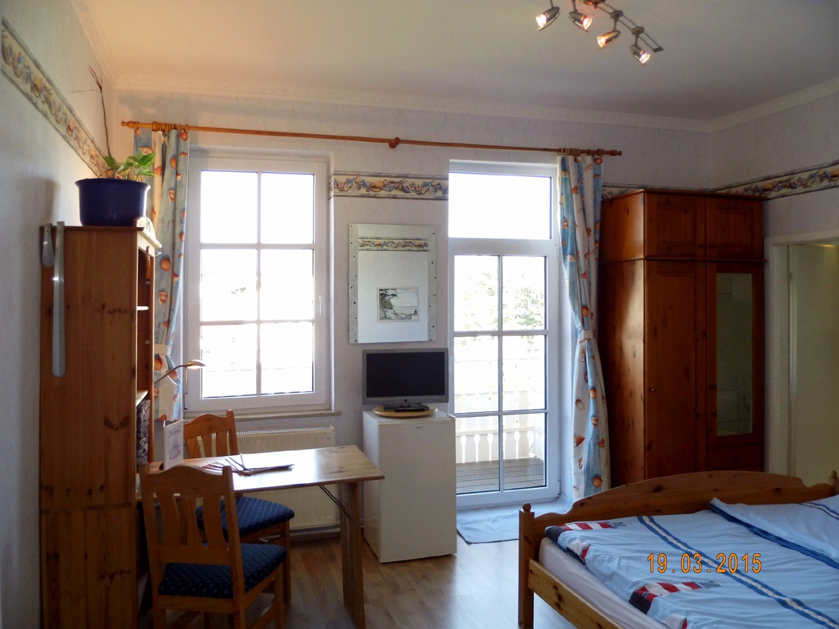Das mit Laminat ausgelegte Doppelzimmer - mit angrenzendem Balkon - ist zweckmäßig eingerichtet, mit Doppelbett (bezogen mit Spezialbettwäsche), einer Sitzgruppe mit Tisch, Kleiderschrank, kleine Kommode und Bücherregal. Ferner sind ein Külschrank, Wasserkocher, TV mit DVD-Spieler und Radiowecker (mit CD) vorhanden.
