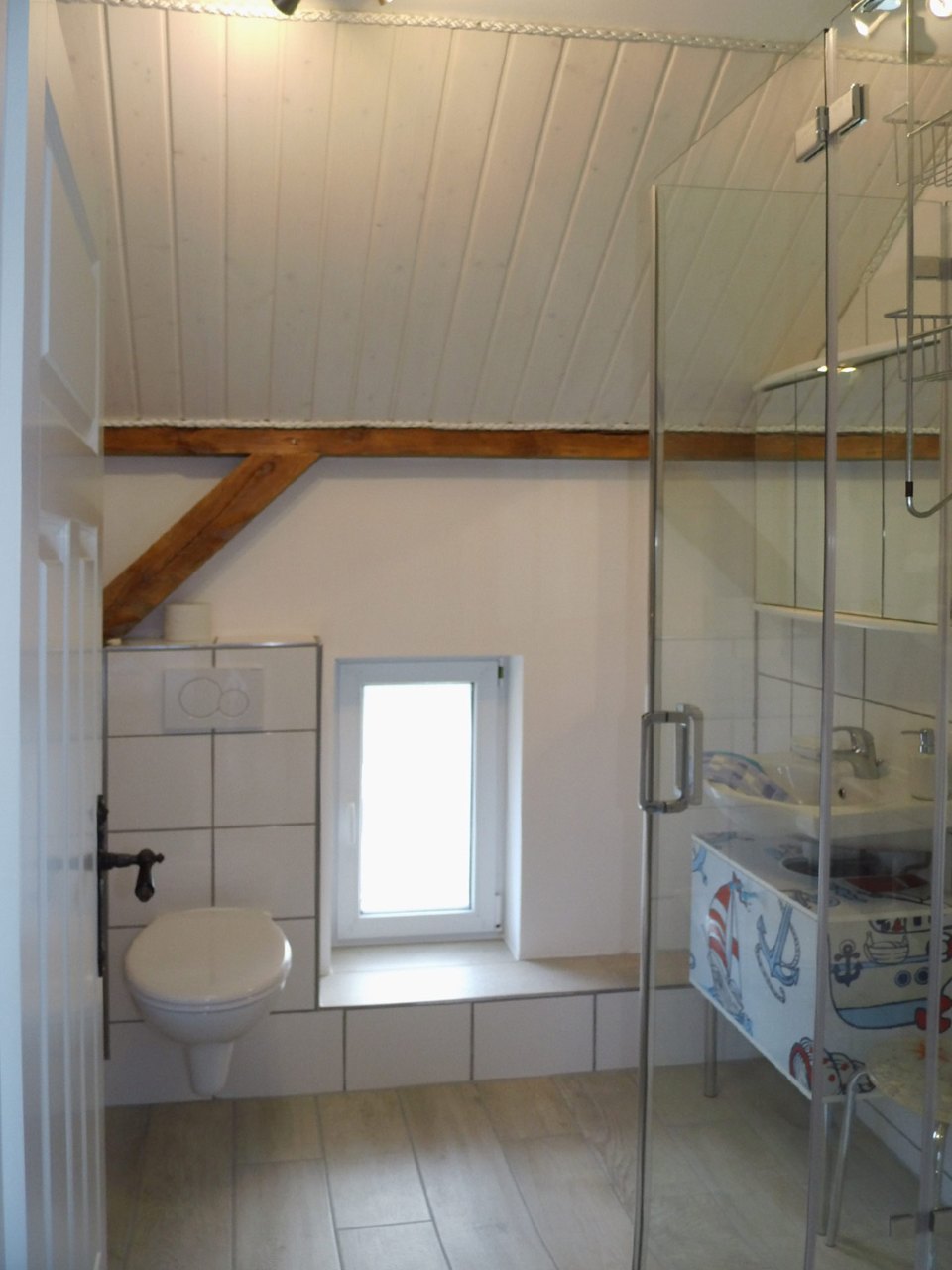 Das lichtdurchflutete Bad ist ausgestattet mit einer Duschkabine, WC, Fön, Waschtisch mit Unterschrank sowie Spiegelschrank und notwendiger Ablageflächen.