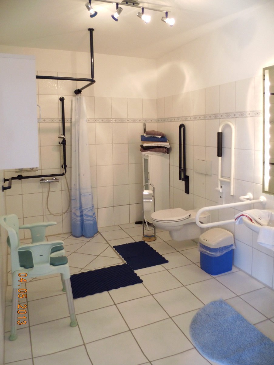 Ein Duschstuhl oder Duschrollstuhl kann auf Wunsch ins Badezimmer gestellt werden.