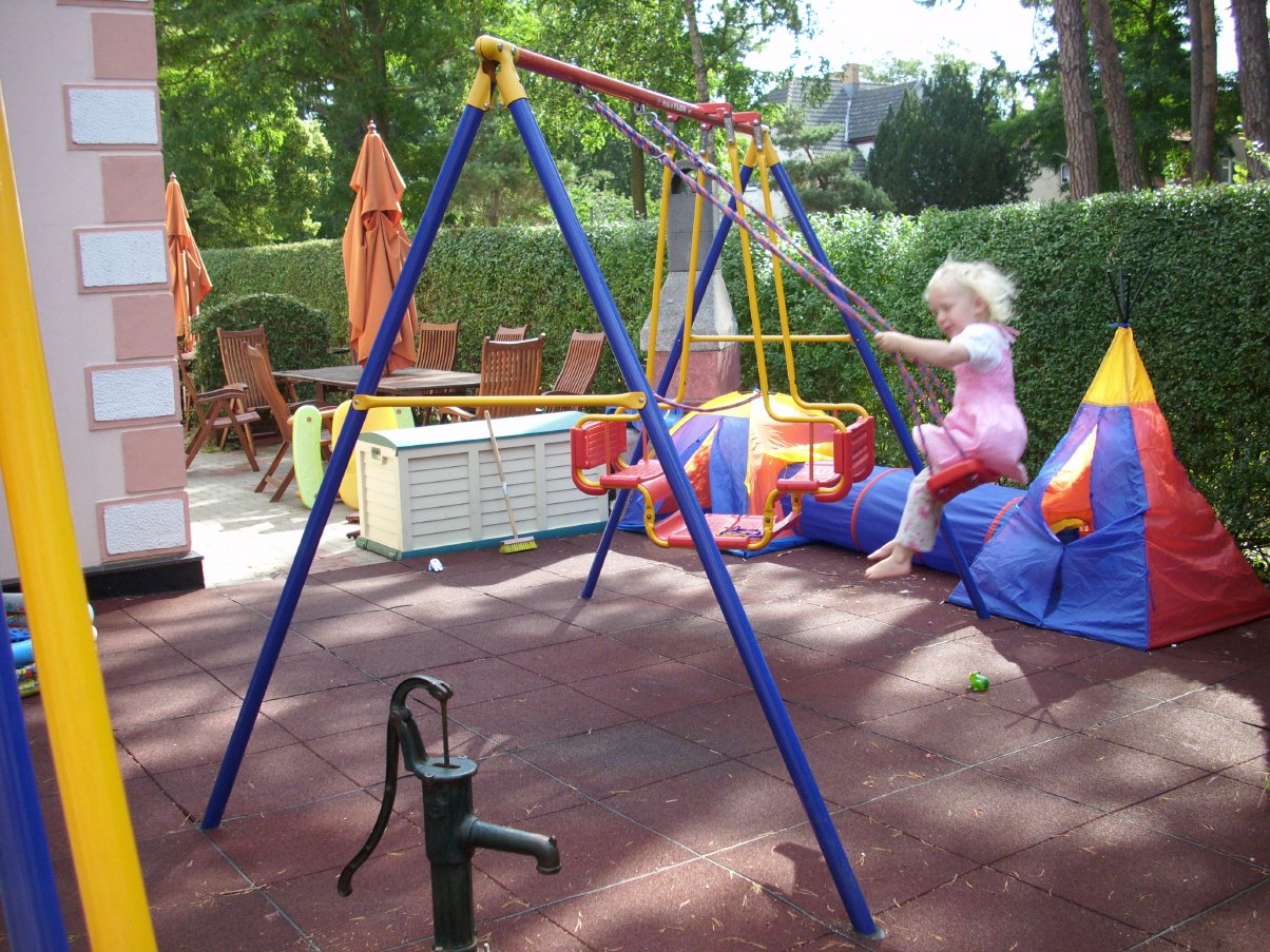 Unser Spielplatz bietet eine Rutsche, zwei Schaukeln und einen kindgerechten Tisch mit Bänken. Eine Babyschaukel ist vorhanden und kann auf Wunsch angebracht werden. In unserem Spieleschrank findet sich genügend Spielzeug für den Strand - Sie brauchen nichts dergleichen mit ins Auto "zu quetschen" :-) ... außerdem: Roller, Rutsche-Autos, Springseil, Bälle, zwei Tretautos. . .